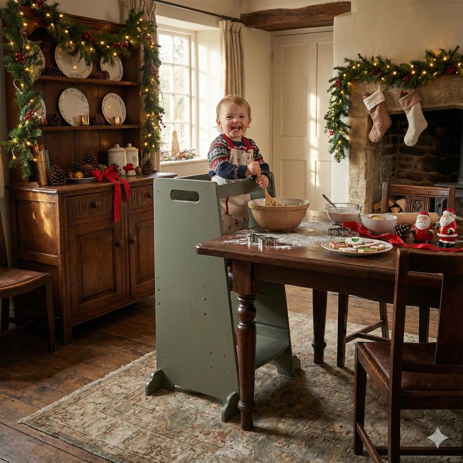 This sage green toddler learning tower is a wonderful way to help your child become more independent and creative. The goal of this toddler kitchen helper is to get toddlers more involved in daily life. It lets them safely cook, clean, and play. With a strong plywood frame and extra safety features like reinforced panels and an anti-climb design, you can be sure that your child can play and explore without worrying.