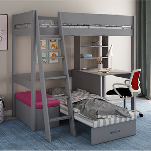 Estella highsleeper bunk bed with sofabed, desk and shelf makes your child's room the best place for many things. It has a comfy loft bed, a corner desk with a shelf for doing homework, and a nice futon for lounging. This innovative design has a pull-out bed and a hidden storage box, which makes it great for sleepovers. It is the best all-in-one solution for sleeping, studying, and relaxing.
