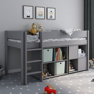 Transform your child's bedroom with the Estella Grey Midsleeper Bed with pull-out desk, chest, and storage unit, the all-in-one solution for sleep, study, and storage! This space-saving bed features a comfortable sleeping area, a convenient pull-out desk, a 3-drawer chest, and a storage cube unit for toys, books, and clothes.
