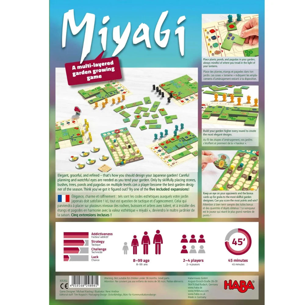 With the Miyabi board game, kids can create a beautiful Japanese garden with precision and skill by arranging elements like stones, bushes, trees, ponds, and pagodas across different levels.