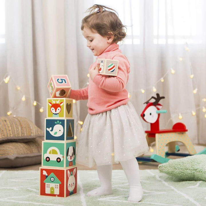 Building game composed of 6 insert-able wooden cubes, which encourages children in developing their coordination and their sense of observation. Each cube face is illustrated with a different theme: animals, numbers, shapes, object, etc. Each cube has a cut-out face with a recognisable shape (heart, star, triangle, etc.) through which an animal from the inserted cube will appear.