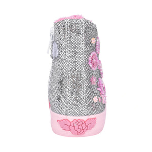 Lelli Kelly girls ankle boots Dafne are the perfect blend of glamour and everyday comfort for your little girl. These trainer-inspired boots feature a dazzling silver glitter upper, adorned with a beaded heart and flower design for a playful, whimsical touch. The faux fur lining ensures warmth, while moisture-wicking insoles provide lasting freshness and extra cushioning.
