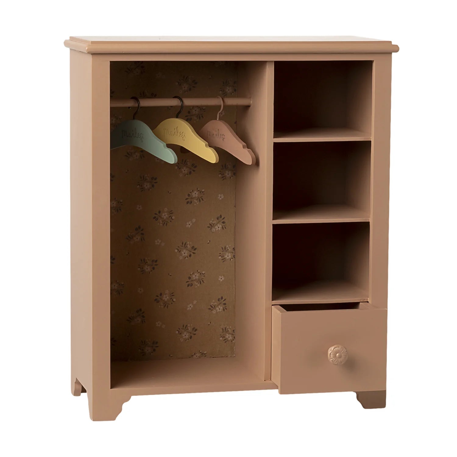 Maileg wardrobe large in dark powder is a beautiful wooden closet for bunny and teddy. It fits perfectly in any part of the kids' room. This closet has a soft, dusty pink finish that makes any playroom or nursery feel cosy. The simple, vintage-style look goes well with other maileg toys, and the sturdy wooden design makes it feel like a real piece of furniture. Kids can organise their toys, take care of them, and enjoy telling stories in new ways.