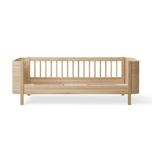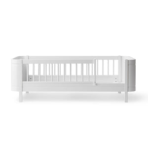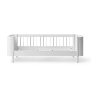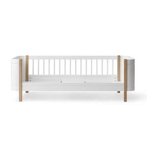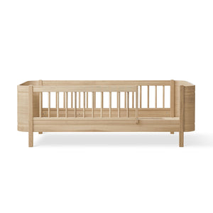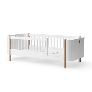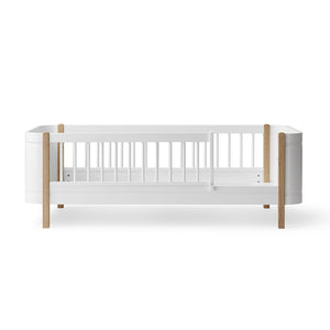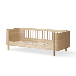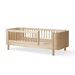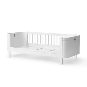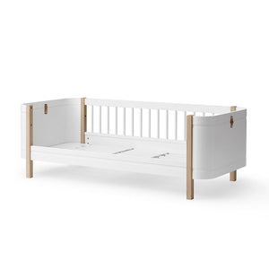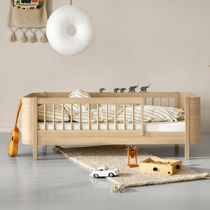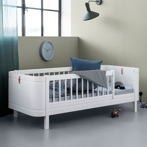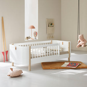 Oliver Furniture wood mini+ junior bed is perfect for a small child’s room. It is compact but still comfortable for sleeping. You can add a bed guard for extra safety. When your child grows, the bed can be changed into a cosy daybed for the room or another small space. The bed is made of solid oak with birch veneer and finished with natural white oil. The design is simple and clean, with hidden screws and a leather strap at the headboard.