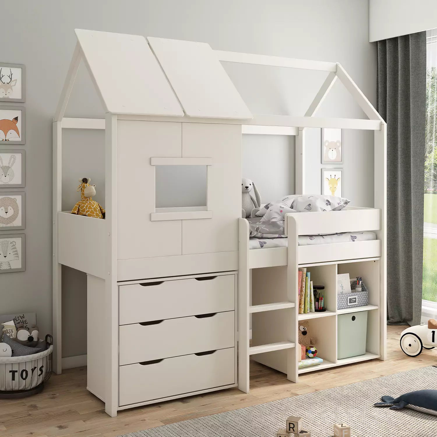 The Midi Playhouse bed with chest is both fun and useful at the same time. Its beautiful white colour and cute features, like a window and a ladder, make it even more appealing. Built to last, keep kids safe, and be stable.