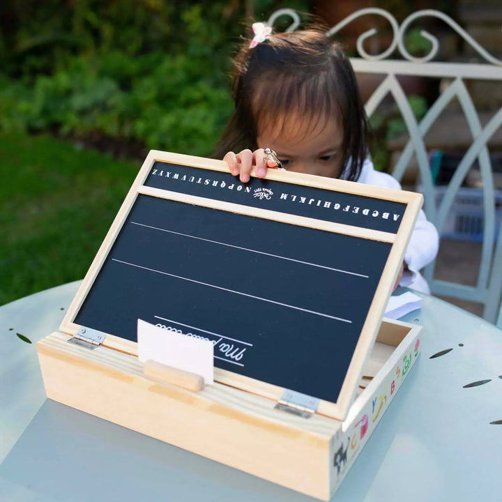 Enjoy early learning with vilac my first school! This cute wooden desk is a complete learning station that helps kids practise letters, words and maths joyfully. This complete set provides hours of creative, screen-free learning for preschoolers.